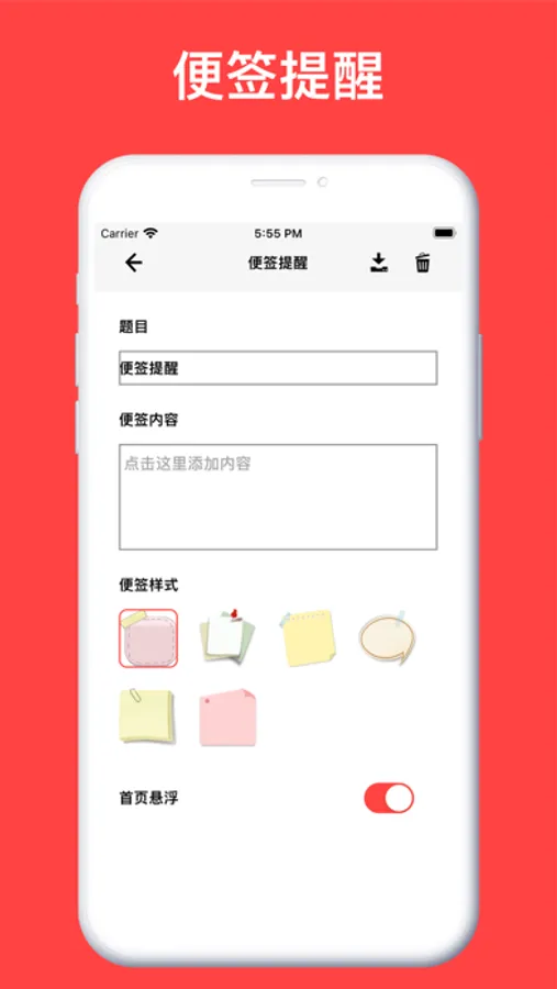 以便利贴的形式来提醒你生活中的小事,并且可以悬浮在首页避免忘记。你可以更改便签样式和显示模式。