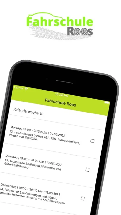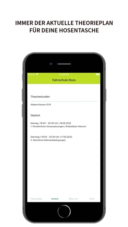 Bleibe auf dem laufenden mit unserem Theorieplan in deiner Hosentasche. Trage ein welche Termine Du besuchst und verfolge deinen Fortschritt.