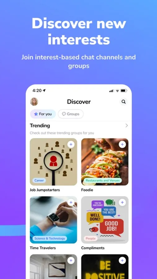 • Groups: Create or join groups and make hanging out easier. Snap a photo and share it with new friends.