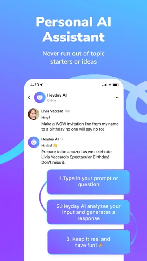 • Reality Chats: Experience a new type of video chat with Heyday's Reality Chats feature. Connect with friends, family, and fellow community members in an immersive and interactive way.