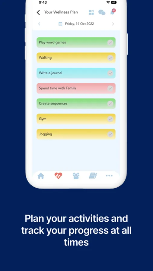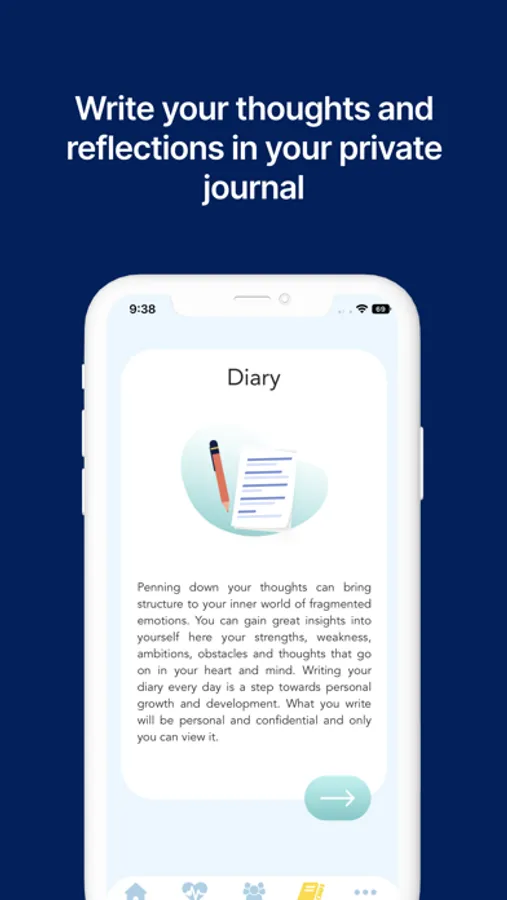 Your wellness is in your hands. Taking small steps towards your wellness can make a huge difference in your life. Get started by Checking in your daily mood or responding to the daily reflections. Use the Diary to pen down your thoughts, feelings and experiences. These simple everyday exercises can help you gain deeper insights and understand your triggers over time, allowing you take control of your life.