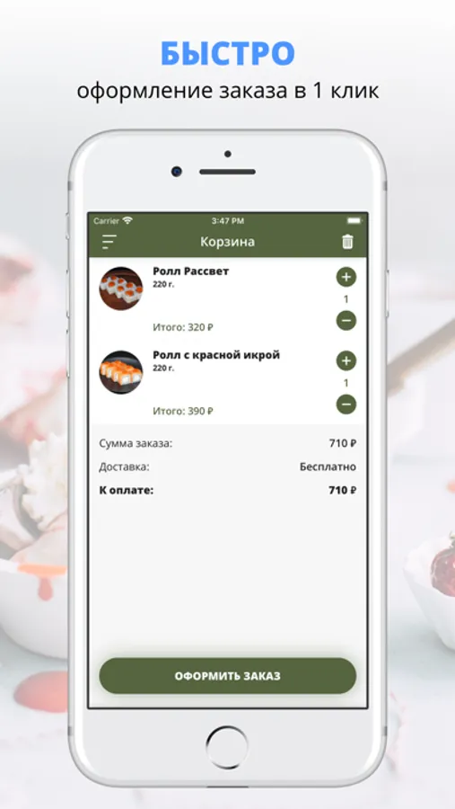 Скачивайте наше приложение, оформляйте заказ и наслаждайтесь любимой едой, где бы Вы ни были! Приятного аппетита!