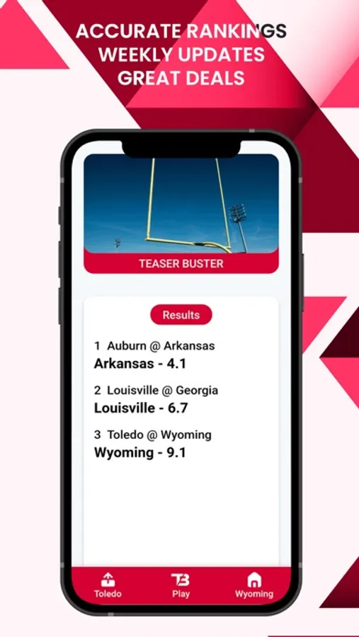 TeaserBuster app provides NCAA Football games predictions about which team is likely to win. This app takes into account the stats of players and the whole entire team. After all the analysis, it comes up with the odds of winning or losing of a team.