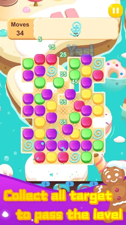 Your objective in Cake Land 2 is to tap two or more adjacent cakes of the same color twice to collect them. Each successful collection will bring you closer to victory. The more cakes you collect in one go, the higher your score will be. So be strategic and aim to blast as many cakes as possible in each move!