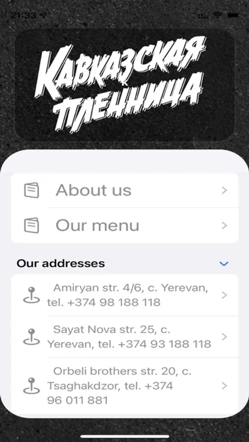 Вы можете посмотреть раздел "О нас", немного истории. В разделе "Меню" ознакомится с нашим меню. Также просмотреть контактные данные и