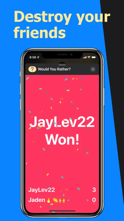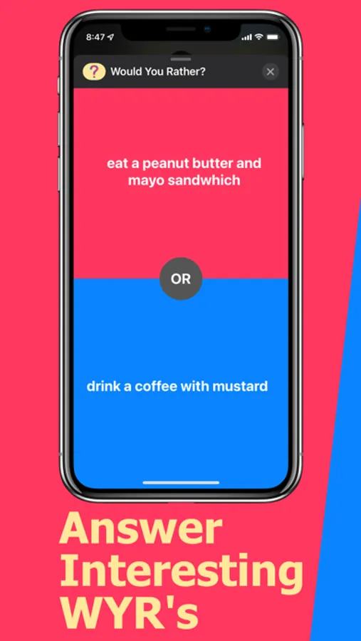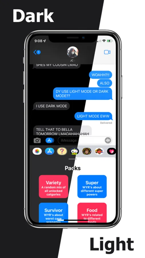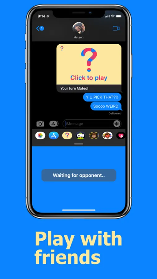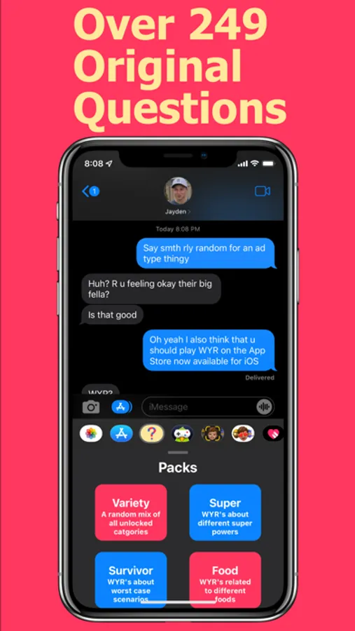 Play with your friends like never before on iMessage. We are the first competitive "Would You Rather" iMessage app. We are also the best "Would You Rather" app of all time. There's hundreds of unique family friendly "Would You Rather" questions, so you'll never get bored. All of our questions are 100% original and not the same ones you've heard millions of times.