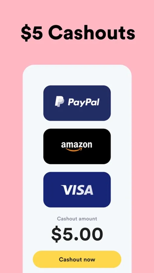 We offer instant cashouts to PayPal and 70+ gift cards. Our gift card rewards include Amazon Gift Cards, Visa, and Walmart.