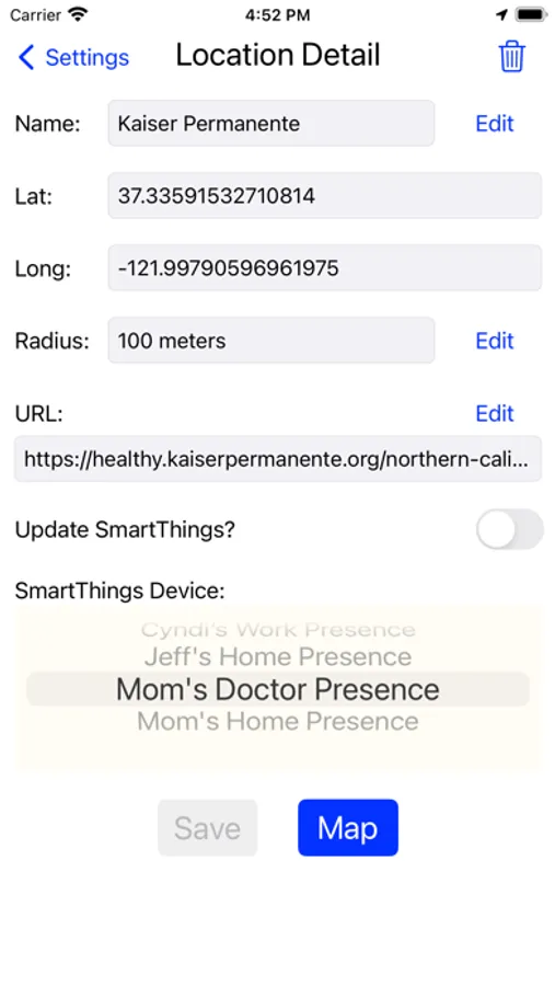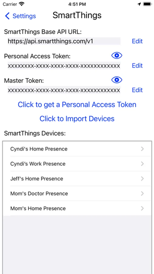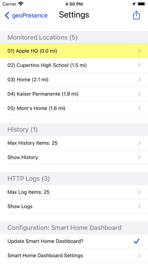 geoPresence turns your iPhone into a Mobile Presence Sensor that you can integrate with SmartThings and/or your own custom Smart Home Dashboard. It allows each iPhone user to track arrival and departure at up to 20 different locations and can optionally send those events to SmartThings and your Smart Home Dashboard.