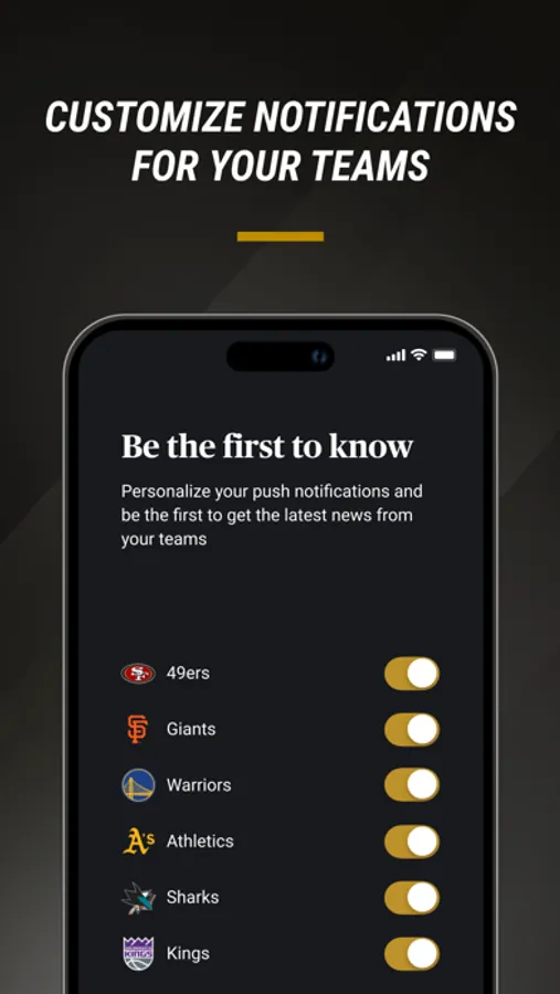 - Customized push notifications for sports alerts about the Warriors, 49ers, Giants, Kings, Athletics, and Sharks