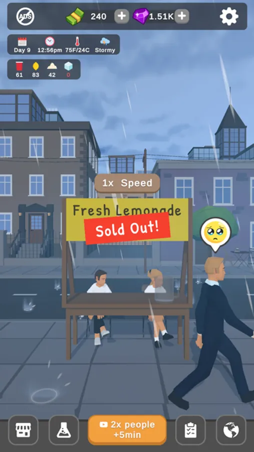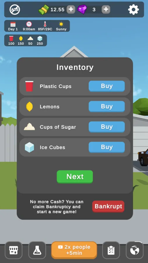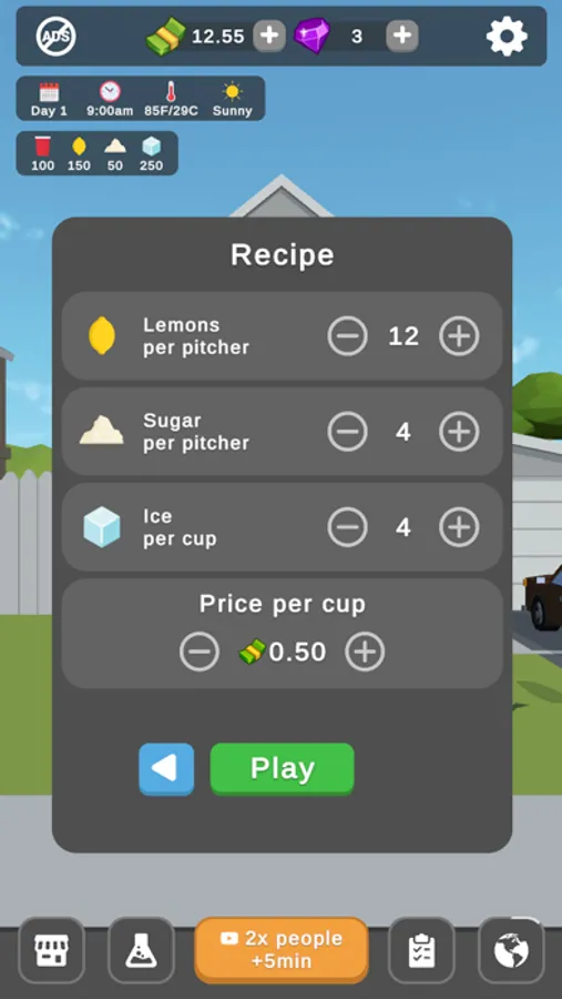 Buy cups, lemons, sugar, and ice, then decide your recipe based on the weather and how much cash you want to charge customers. Start with the given basic recipe, then try to change the recipe and see if you can make the recipe better to make more cash. Try to change your lemonade sale price based on the weather conditions. If you get good reviews and have happy customers even more people will shop up to your stand. If you make enough cash you can upgrade your stands location to the Park or the City to sell Lemonade for up to 4x more cash! At the end of the game, you'll see how much money you made.