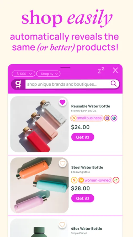 You’ve never experienced an app like this. The goodbuy app works auto-magically to intercept your shopping on mega-retailers’ sites and provide incredible items all from unique, small businesses. Forbes, The Zoe Report, and POPSUGAR all agree that shopping small and consciously has never been easier.