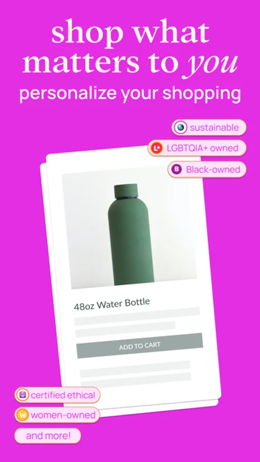 With the goodbuy app, you can personalize your profile and filter your shopping by the values that matter most to YOU, including: AAPI-owned, American made, Black-owned, certified ethical, cruelty free, family-owned, Indigenous-owned, Latina/o/x-owned, LGBTQIA+ owned, local, owner with disability(ies), sustainable, vegan, veteran-owned, MENA/SWANA-owned, and women-owned.