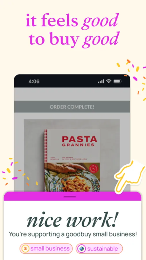 Shop small easily with the goodbuy app. Get automatic small business alternatives to mega retailers. Open a Safari window, go to your usual mega retailer site, and goodbuy will pop up with the same, or better, product from one of our 185k+ emerging brands and boutiques. Download the app today and get goodbuy on your mobile Safari browser.