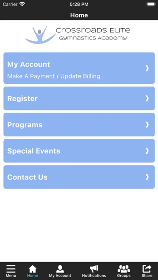 The Crossroads Elite Gymnastics Academy app is an easy-to-use, on-the-go way to access everything Crossroads Elite Gymnastics Academy has to offer right from your smartphone.