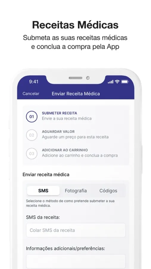 • Aviar as suas receitas médicas de forma simples e eficaz;