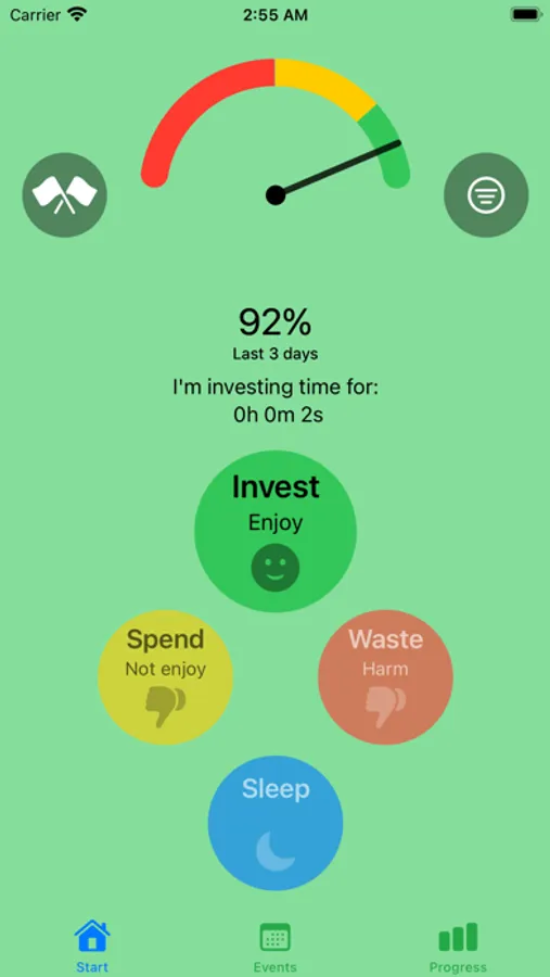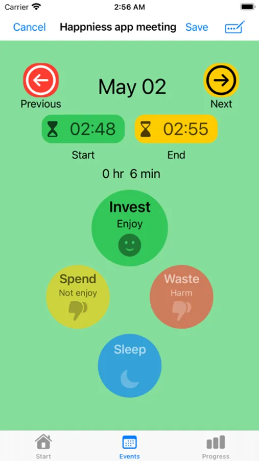 Happiness depends on what you do with your time at home, at work, at play and other times. The buttons are INVEST time (enjoy = more points), SPEND time (not enjoy = no points), WASTE time (harm = lose points) and SLEEP.