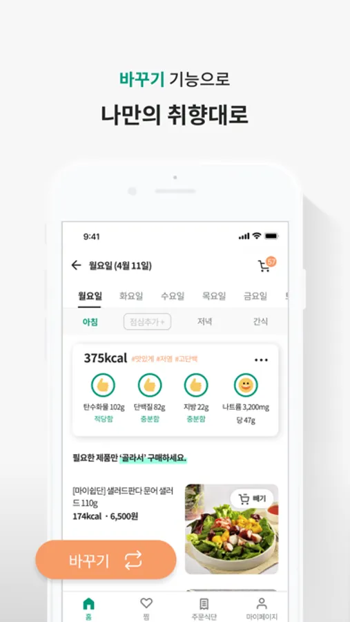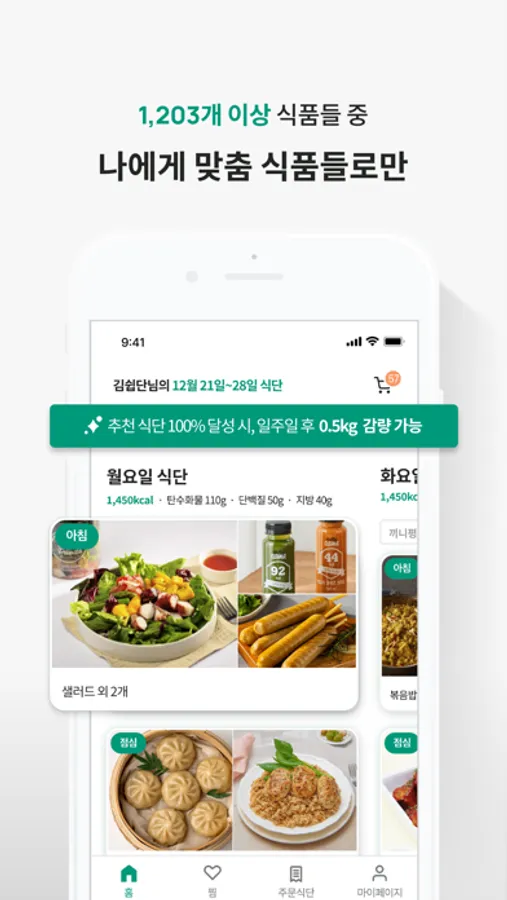 1203개 이상 식품들 중 나에게 딱 맞는 식품들로만 구성된 식단을 받아보세요. 칼탄단지를 고려한 식단으로 이제는 쉽고 건강하게 마이쉽단 하세요.