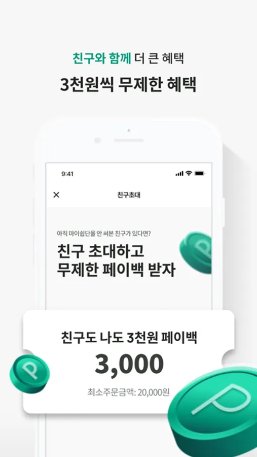 아직 마이쉽단을 안 써본 친구가 있다면 친구랑 같이 시작해보세요. 친구가 첫 주문을 완료하면 3,000원 페이백을 드려요. (쉿) 추천 친구수는 무제한이에요.