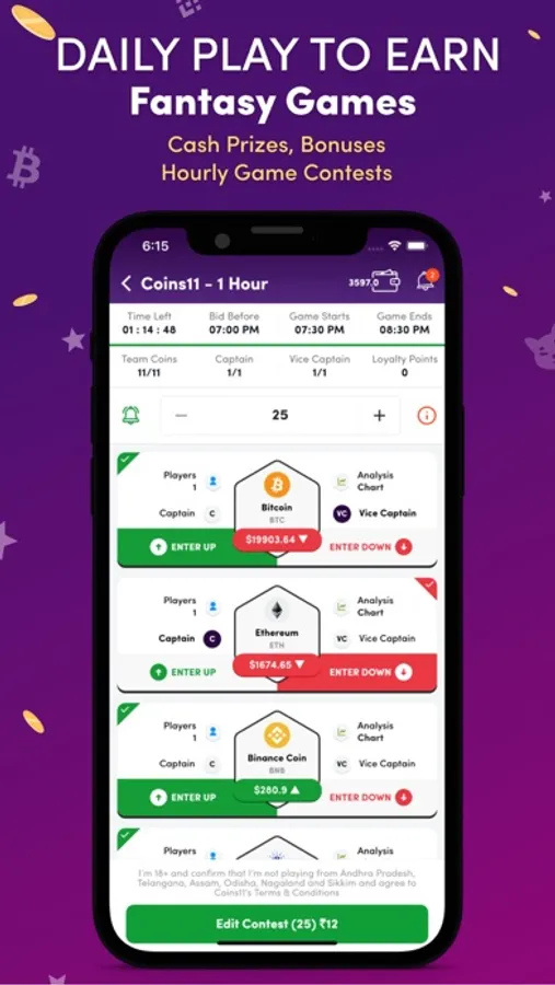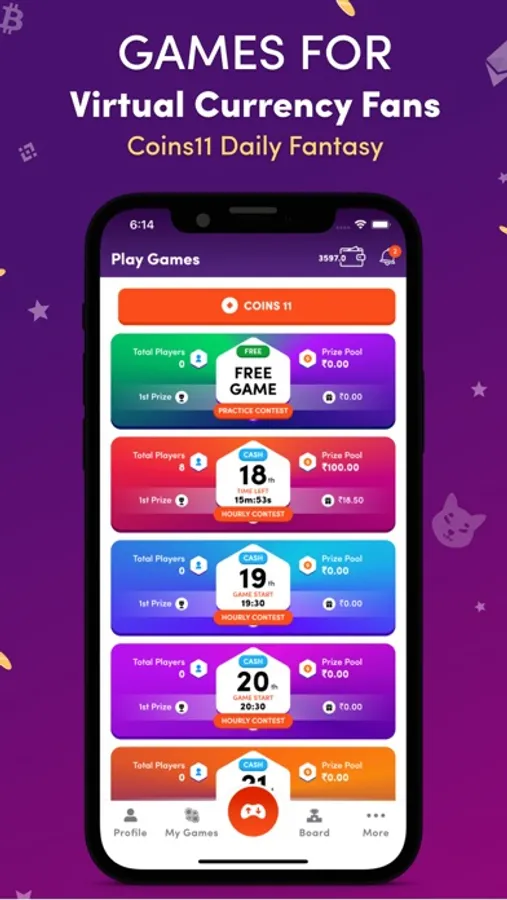 Select a contest from the Coins11 Game's Play Screen. You may choose it based on the game type, time slot, entry fee, and type of contest available. The entry fee and prize for each contest are different. Enter as many contests in different games as you want.