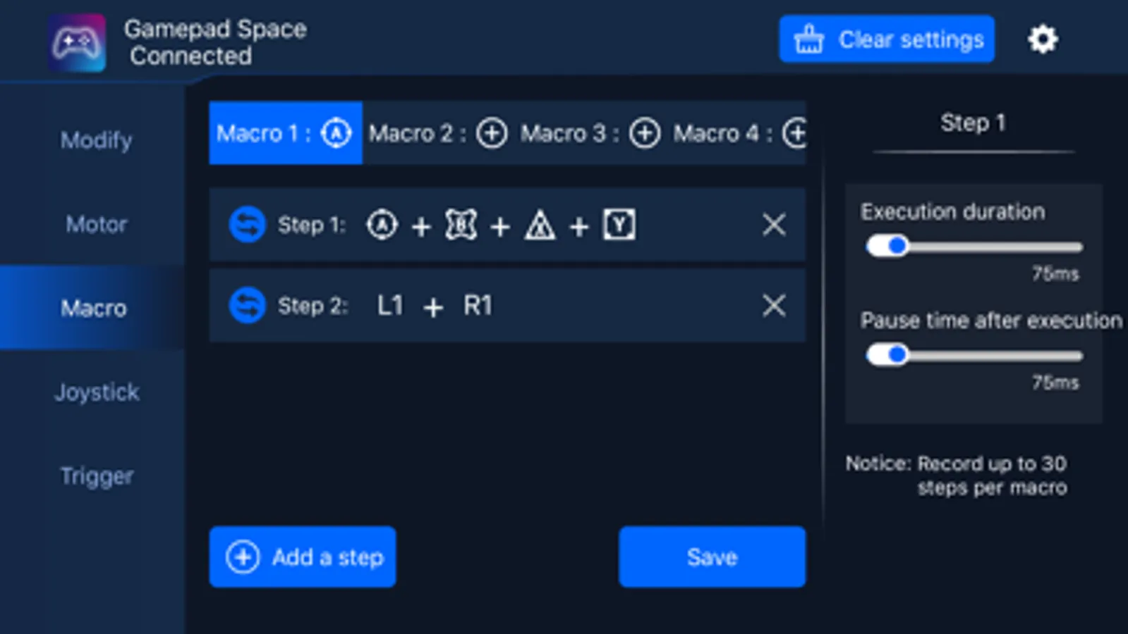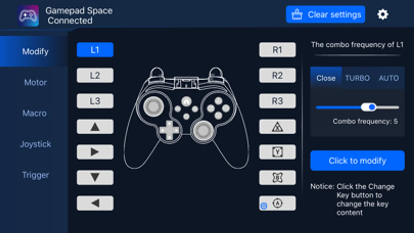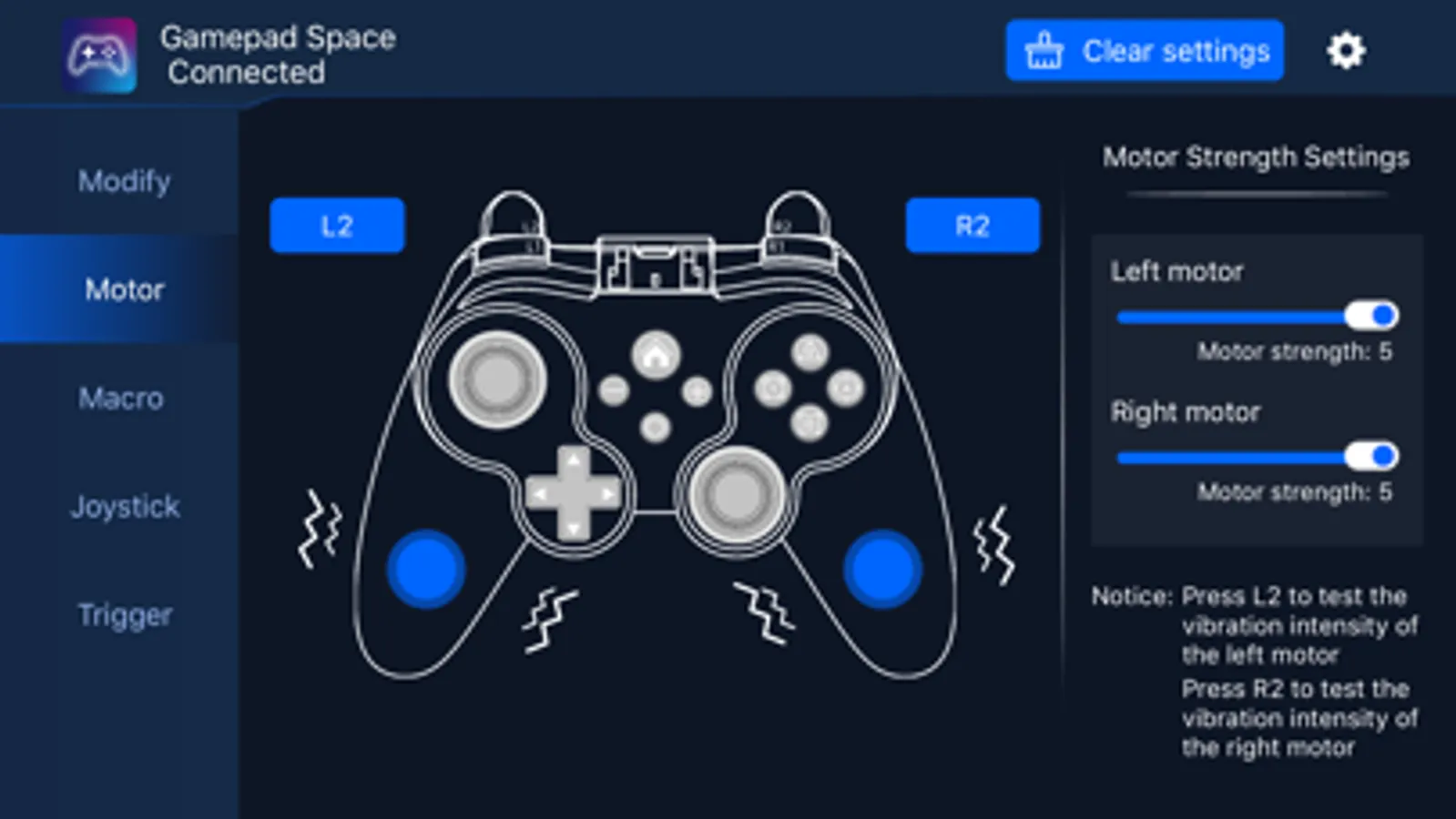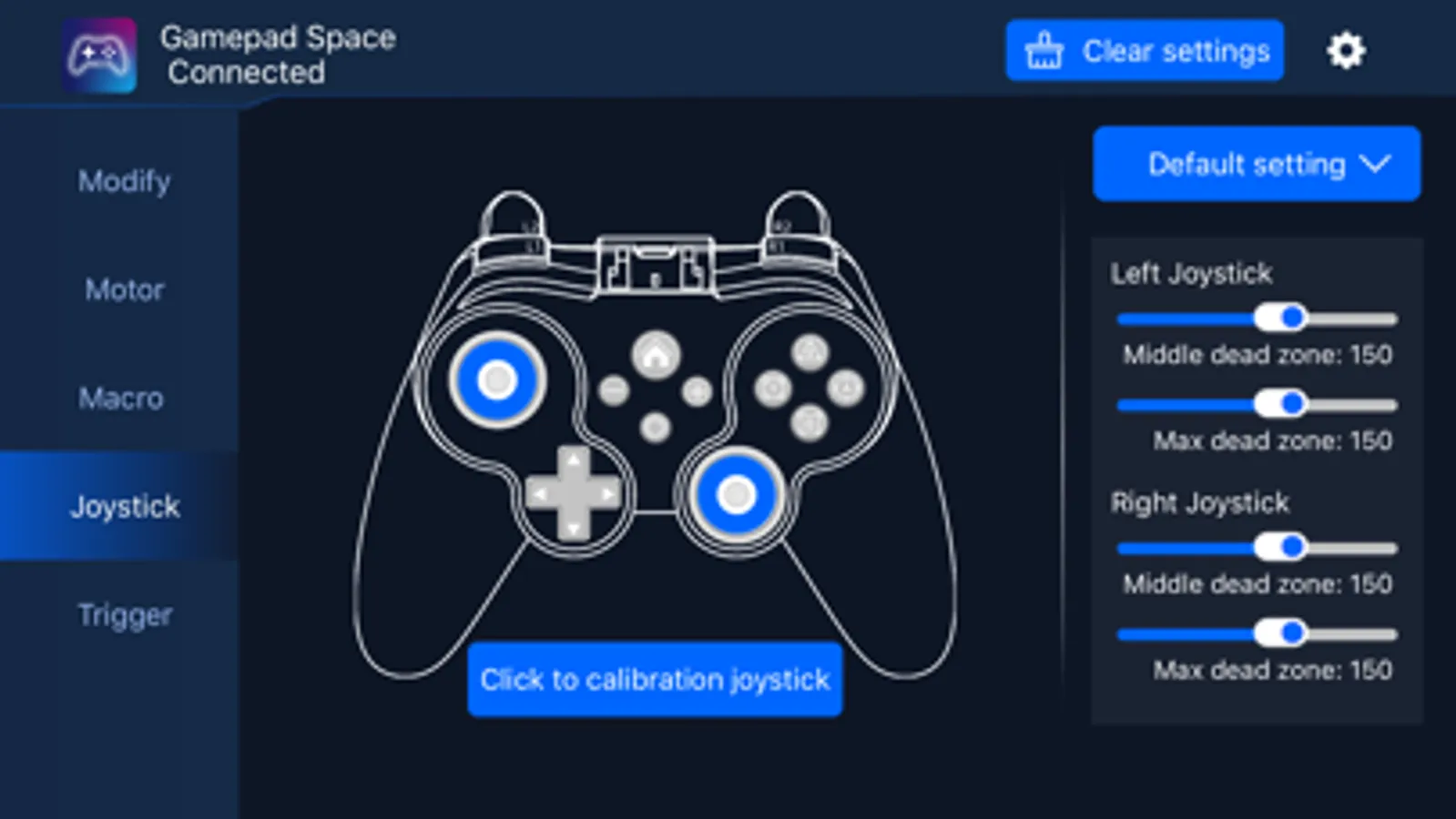 Gamepad Space is a tool APP that can customize the function settings of Bluetooth controller button mapping, button combo, motor properties, button macros, trigger button dead zone, joystick dead zone and joystick mapping after private protocol connection. By modifying the custom button mapping, button combo, motor properties, button macros, trigger button dead zone, joystick dead zone and joystick mapping, etc., the key positions can be adapted to the player's own operating habits or the game the player wants to play.Gamepad Space is a tool APP that can customize the function settings of Bluetooth controller button mapping, button combo, motor properties, button macros, trigger button dead zone, joystick dead zone and joystick mapping after private protocol connection. By modifying the custom button mapping, button combo, motor properties, button macros, trigger button dead zone, joystick dead zone and joystick mapping, etc., the key positions can be adapted to the player's own operating habits or the game the player wants to play.