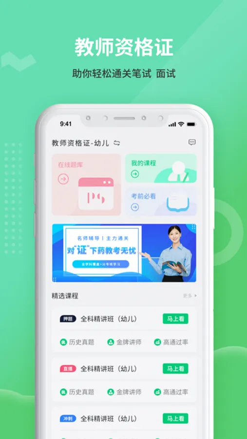 3、统考教师资格证考试真题库、免费视频讲解、直播等,一切尽在教师资格证APP!