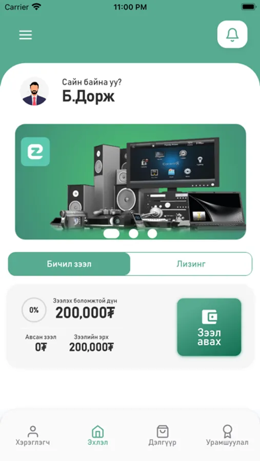 “Ezeel” зээлийн аппликейшнаас өөрийнхөө нөхцөлд тохируулан хэзээ ч, хаанаас ч, хэдэн ч удаа 100,000-1500,000 төгрөг хүртэлх зээлийг тохирсон хугацаанд тогтмол хуваарьтай эргэн төлөх зээлийн үйлчилгээ юм.