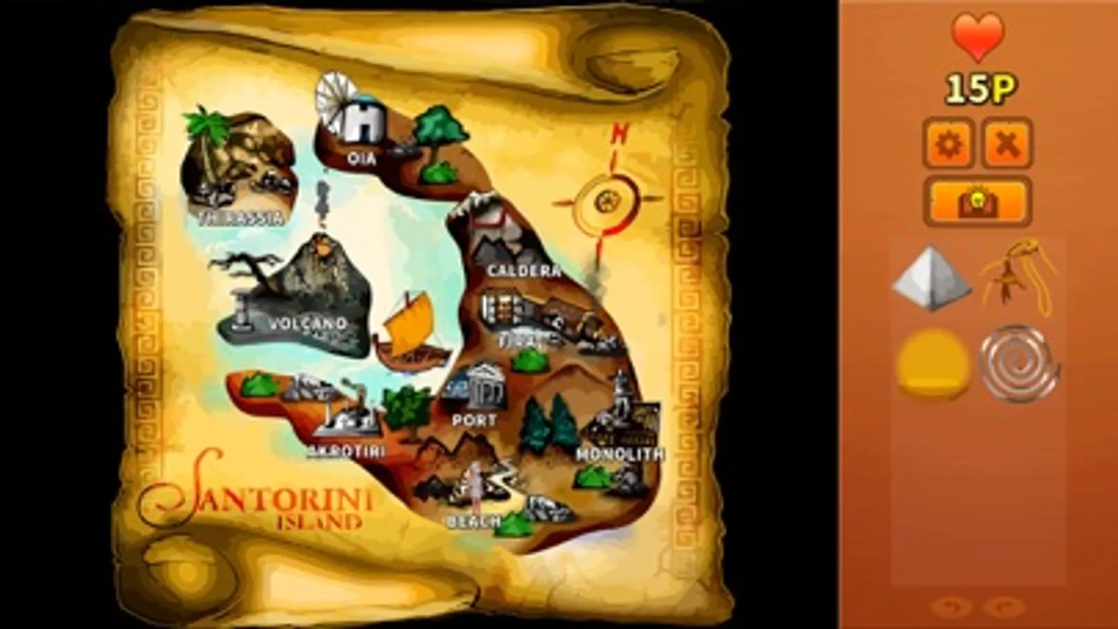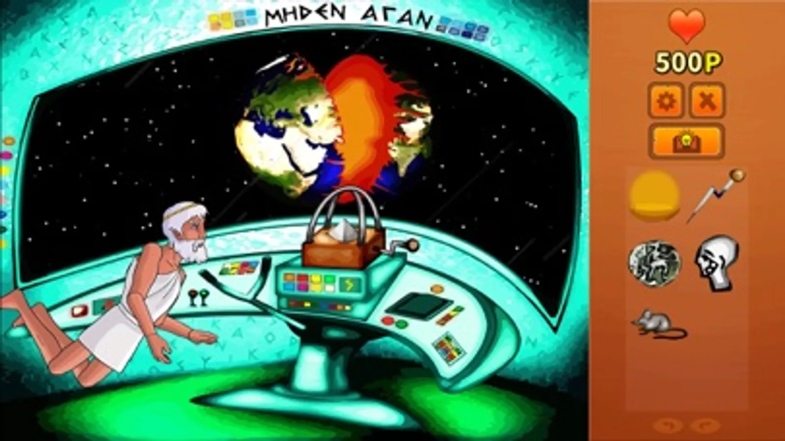 Zeus is summoned back to earth by an ancient security mechanism. The story starts with Zeus flying his spaceship and landing it in the bottom of the Santorini Ocean. In Santorini, he will interact with dozens of weird and wonderful characters and solve many smart puzzles. The game is a big, full length adventure game. He will visit Oia, Akrotiri, Fira, Caldera, Volcano and many more places until he finally discovers his super weapons, the lightning spear and the time machine. But even, then the task is far from over; he will have to set sail to another cluster of Greek islands: Milos, Karpathos, Mykonos and Delos. There, he must find the scattered pieces of the time machine so that he can use it to save the planet. He will also meet Europe and take her to Minoan Crete in the Knossos timeframe. He will enter the famous labyrinth of Knossos, go to Festos and find the missing pieces to complete the mission.