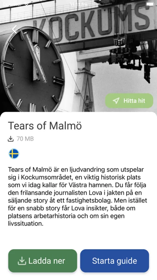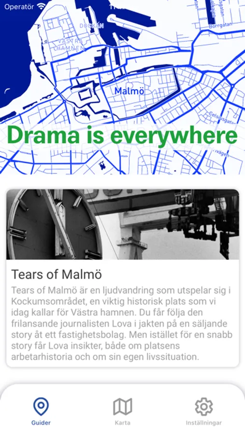 Vardagen, jobbet, staden, sociala medier – det är ju smockfullt med drama överallt! Och det enda Malmö Stadsteater älskar lika mycket som drama, det är Malmö. Därför har vi skapat en app där vi, förutom att visa de scener vi spelar på i Malmö, erbjuder dramatiserade ljudvandringar direkt i stadsrummet. Första vandringen är ”Tears of Malmö” som utspelar sig i Kockumsområdet, en viktig historisk plats som vi idag kallar för Västra hamnen. Via appen, ett par hörlurar och själva platsen kommer du bokstavligen att få följa den frilansande journalisten Lova i jakten på en säljande story åt ett fastighetsbolag. Men istället för en snabb story får Lova insikter, både om platsens arbetarhistoria och om sin egen livssituation. En dramatiserad berättelse som bygger på intervjuer med personer som jobbade på Kockums.