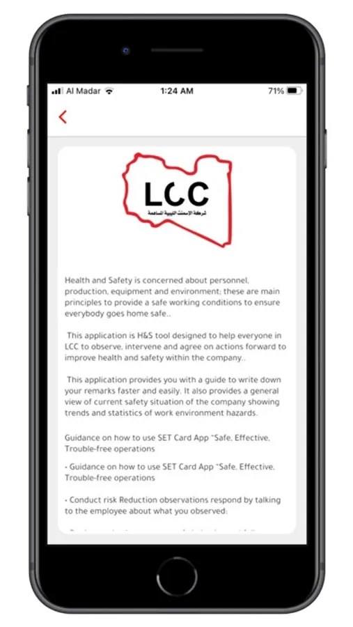 هذا التطبيق هو أداة مصممة لمساعدة الجميع في شركة الاسمنت الليبية المساهمة لمراقبة والتدخل والاتفاق على الإجراءات المستقبلية لتحسين مستوى السلامة والصحة المهنية داخل الشركة.