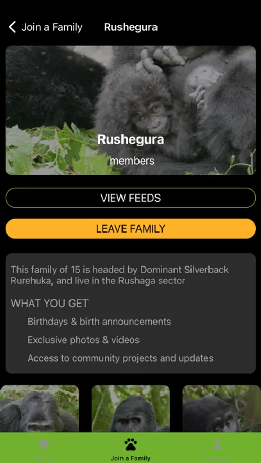 My Gorilla Family gives you an all-access pass to the home of more than 50% of the world’s remaining mountain gorillas. You can follow their daily excursions, celebrate their birthdays, family migrations and receive updates from the rangers who protect the gorillas and know them best. Get to know the different habituated gorilla families and fall in love with their undeniably charming personalities!
