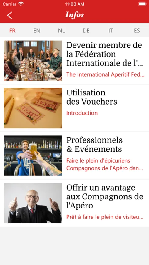 L'application mobile APERITIF est l'outil d'échange principal où chacun peut trouver en géolocalisation les établissements membres de la Fédération et les événements qui offrent ces avantages aux Compagnons de l'Apéritif.