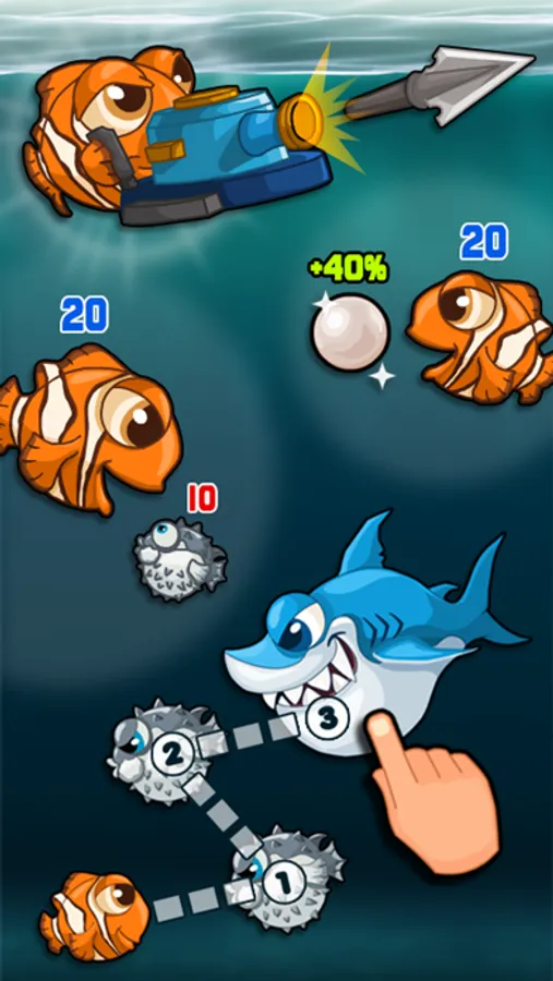 Many fish enemies approach the clown fish in ocean castle. You need to eat them, get treasures and save partner.