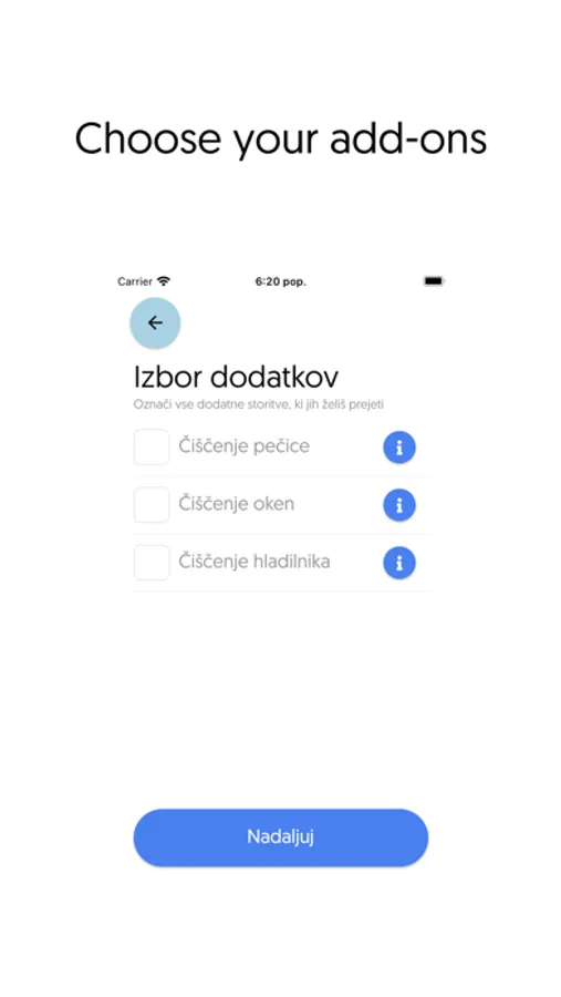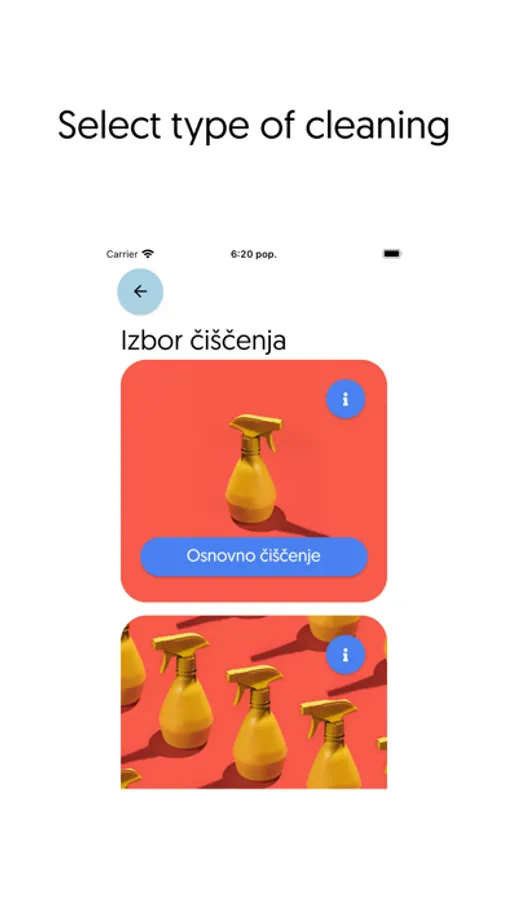 We offer on-demand residential property cleaning services, ordered through the app. You can choose the size of your apartment, any addons you want to have cleaned, and any additional requests at the end of the order process. In the app, you can review, modify or cancel the order as well as see some useful house organizing tips and promotions available under "news".
