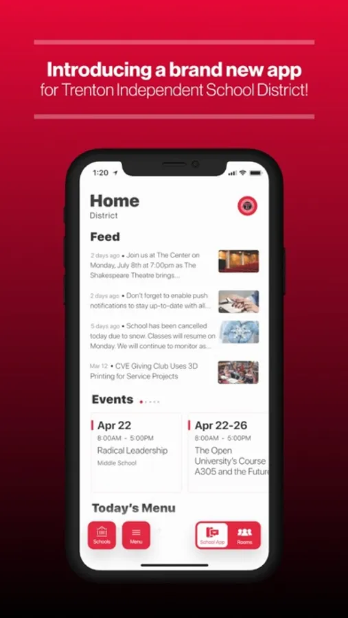The event section shows a list of events throughout the district. Users can add an event to their calendar to share the event with friends and family with one tap.
