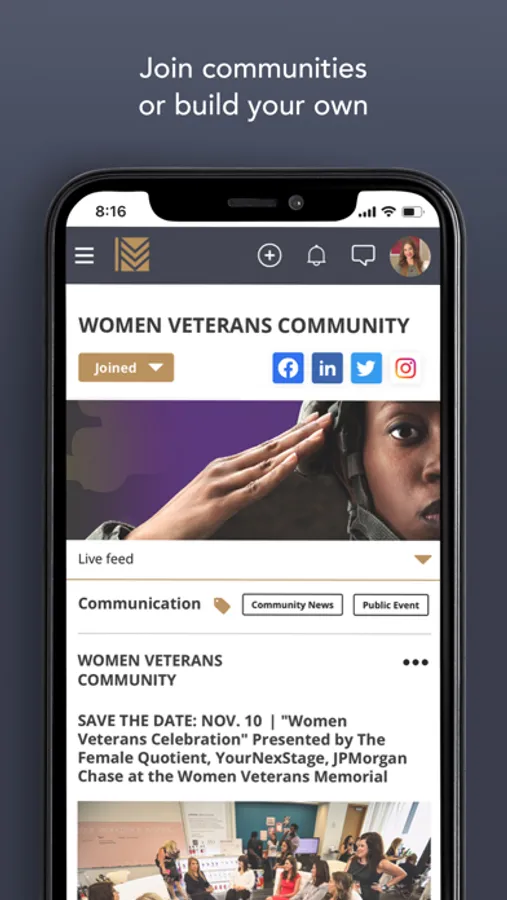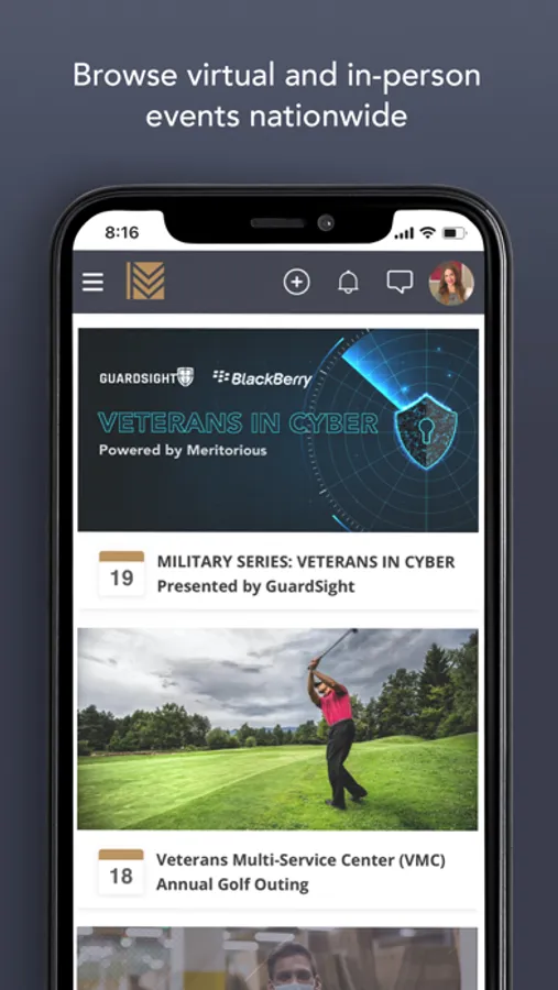 Whether a veteran or military spouse is looking to find support for their business, mentor a transitioning service member struggling in their job search, partner with a local nonprofit, or just have a conversation, Meritorious makes it easier for military-connected individuals to intersect. Our app includes a live feed, member directory, direct messaging, virtual and in-person events, business hub, mentor database, career search, and more.