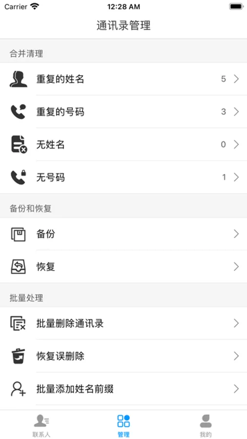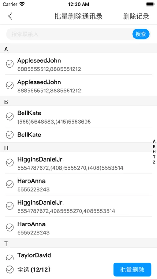 支持快速批量删除iPhone手机通讯录的联系人,并支持误删出的联系人恢复找回。