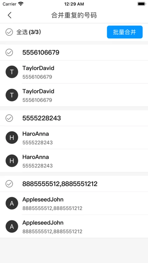 智能检测通讯录中重复的电话号码、联系人姓名和邮箱地址,快速、批量合并清理。让通讯录不在杂乱。