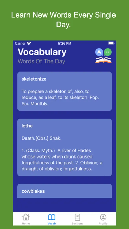 Word Quiz is a mode that challenges your knowledge of English words! In this mode, you will be given a word and four possible definitions. You must select the correct definition for the word.