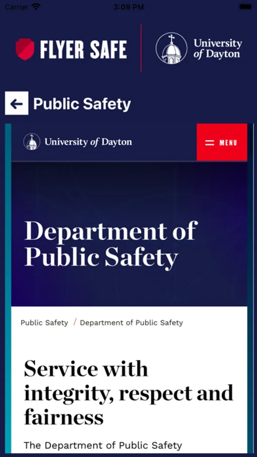 Flyer Safe is the official safety app of the University of Dayton. It is the only app that integrates with the University of Dayton's safety and security systems. The Public Safety Office has worked to develop a unique app that provides students, faculty, and staff with added safety on the University of Dayton campus. The app will send you important safety alerts and provide instant access to campus safety resources.