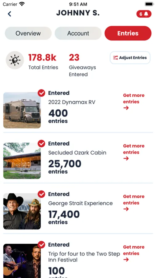• View your monthly entries into every current giveaway and access the ability to move and allocate your entries to where you want to win the most.