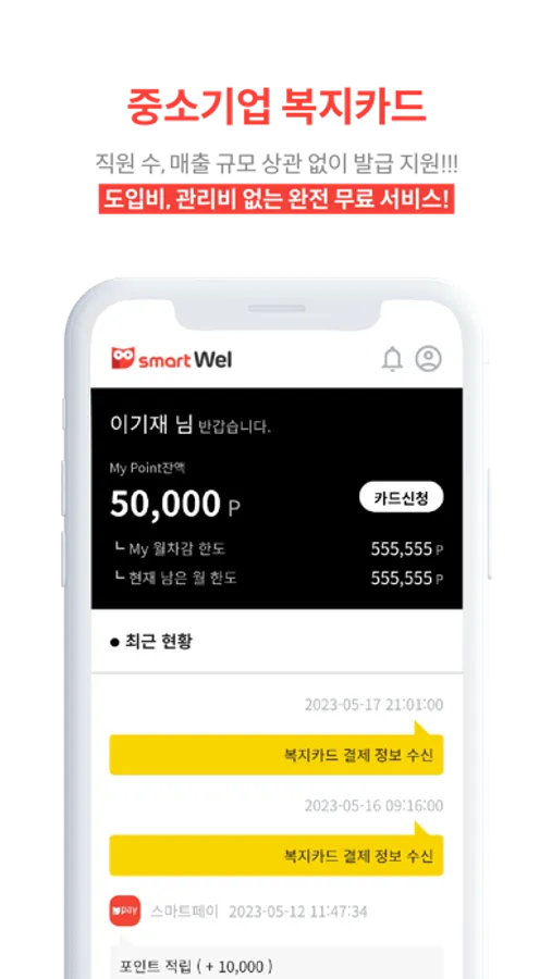 ㈜스마트웰 복지카드 및 식대카드를 이용하는 회원사 임직원을 위한 모바일 복지카드 차감 청구 관리 서비스입니다.