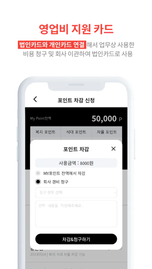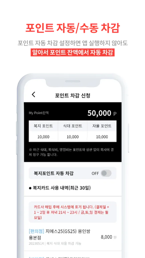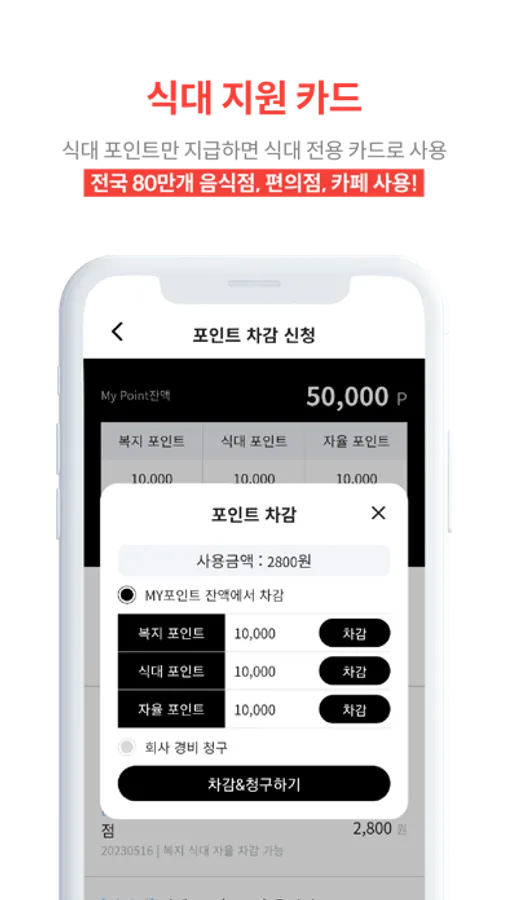 복지(식대) 신용카드 결제 금액을 포인트로 차감 할 수 있습니다.