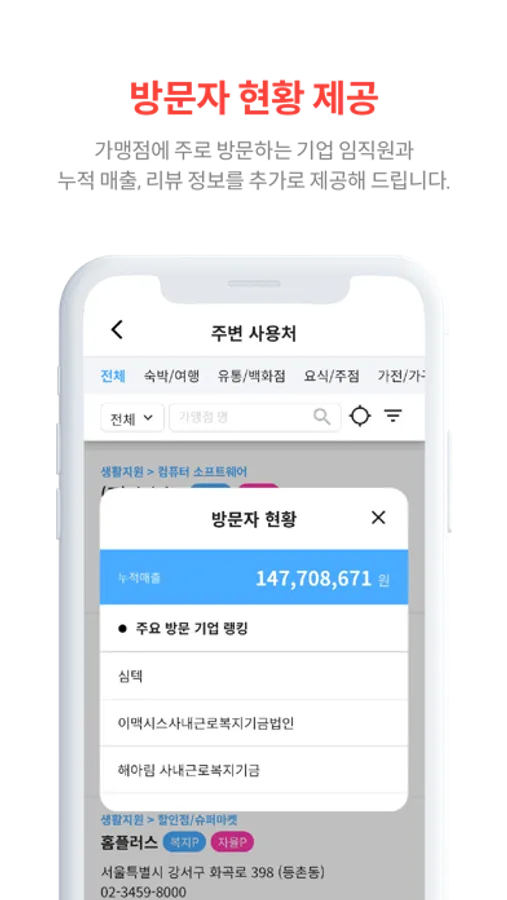 기업에서 배정한 복지 포인트, 식대 포인트, 자율 포인트 배정 내역, 사용 내역, 취소 재 적립 내역을 앱에서 실시간으로 확인 가능