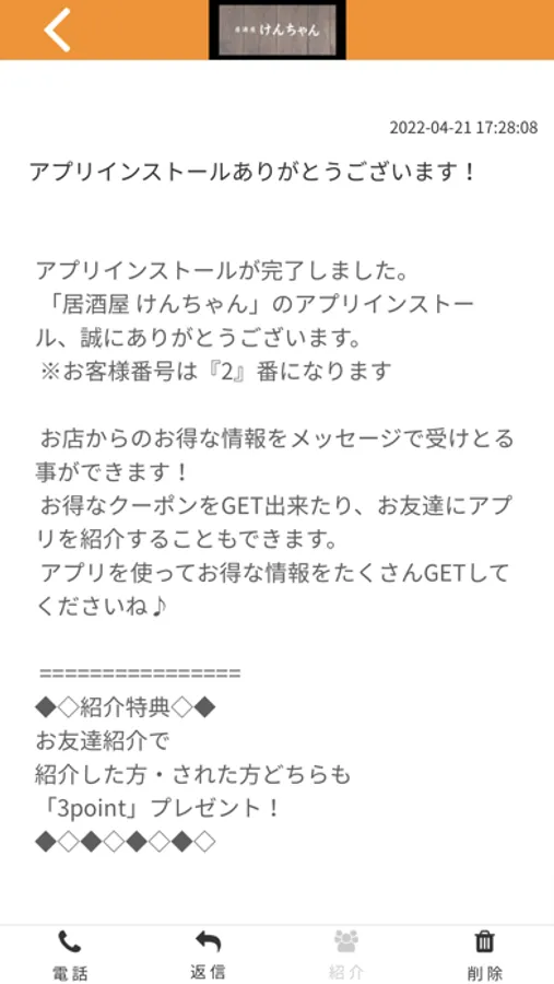 居酒屋 けんちゃんのアプリをSNSを通じてお友達に紹介する事ができます。