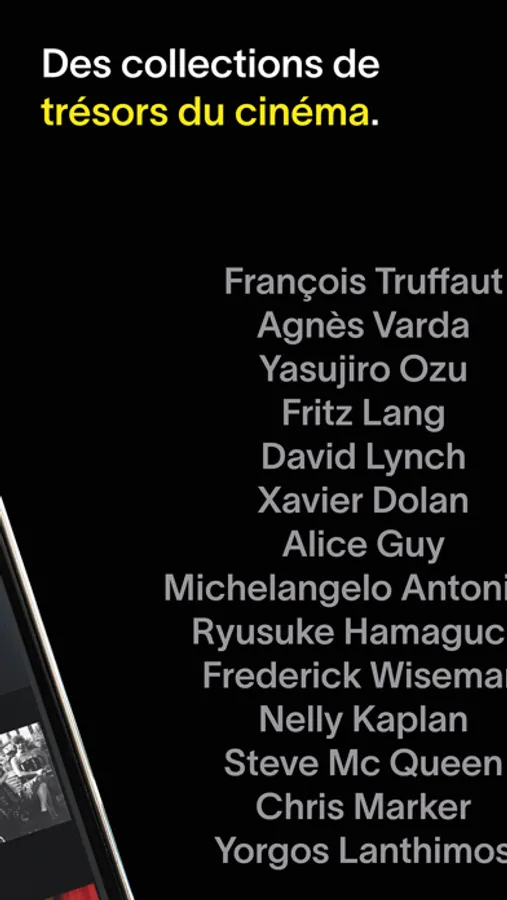 Vous pourrez retrouver les œuvres des cinéastes qui marquent l’histoire du cinéma : François Truffaut, Agnès Varda, Yasujiro Ozu, Fritz Lang, David Lynch, Xavier Dolan, Alice Guy, Ryusuke Hamaguchi, Nelly Kaplan, Steve Mc Queen, Chris Marker, Yorgos Lanthimos…