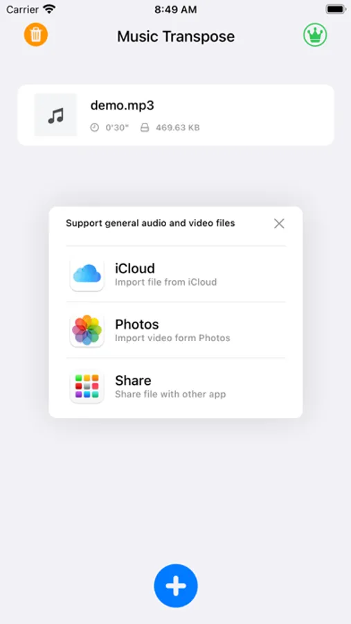 The app provides information on how to import files from other common apps to the Music Transpose app. Other apps can usually share files directly to the Music Transpose app through the share function. You can also use AirDrop to send audio or video files from an Apple computer or an iPhone/iPad to the Music Transpose app.