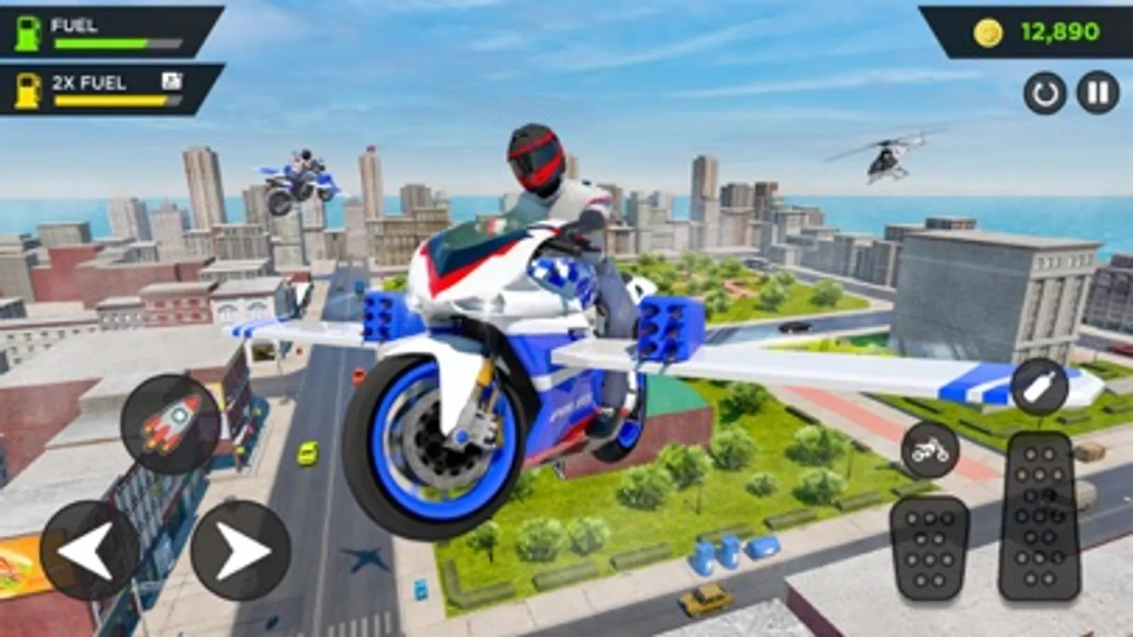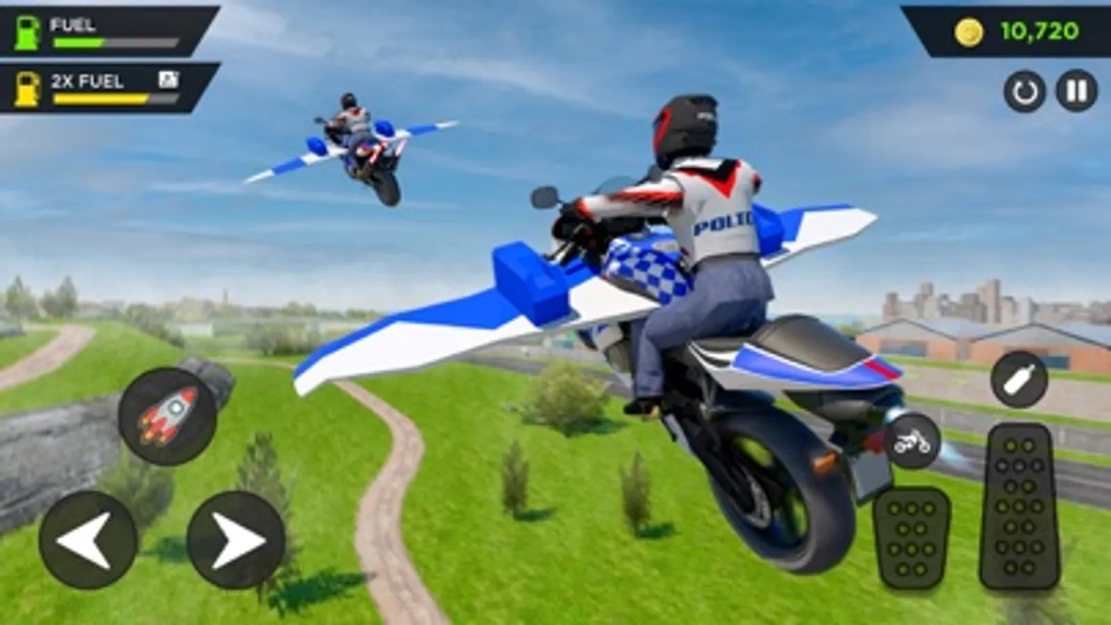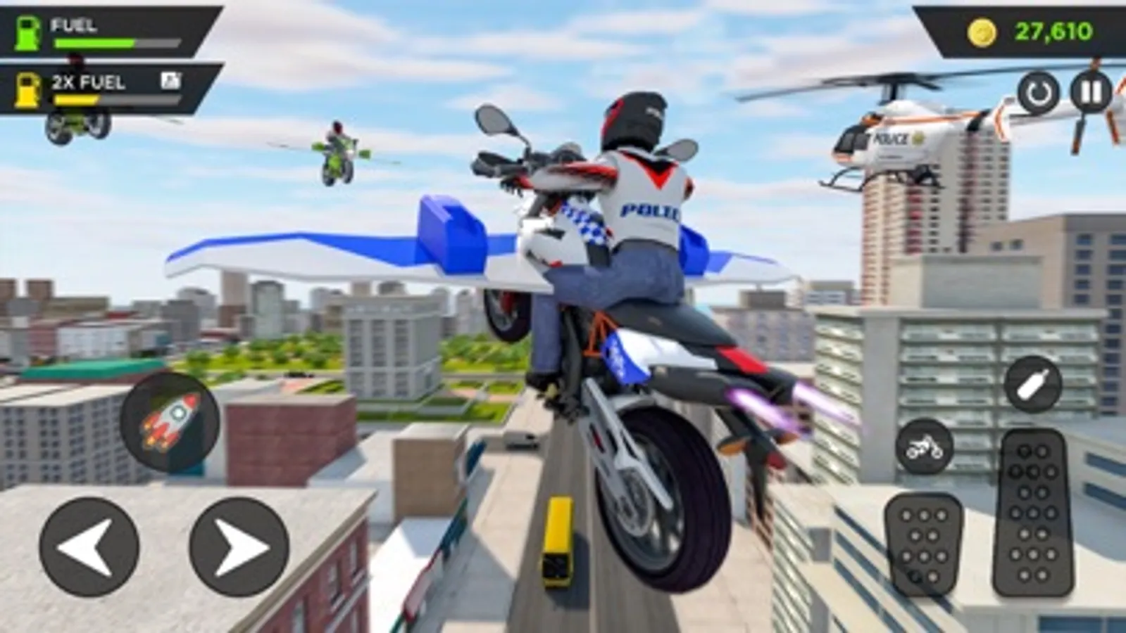 You will enjoy a thrilled and action-packed police bike flying simulator game, where you can flying your sports bike and get in to the different missions of police officer who drive flying bike.