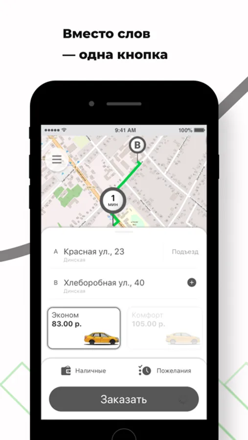 Откройте приложение, укажите адрес и закажите такси, нажав на одну кнопку.