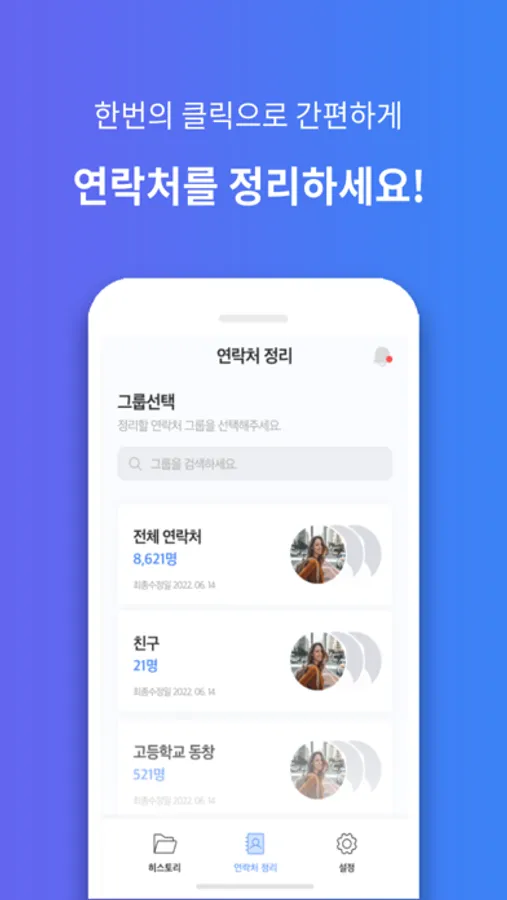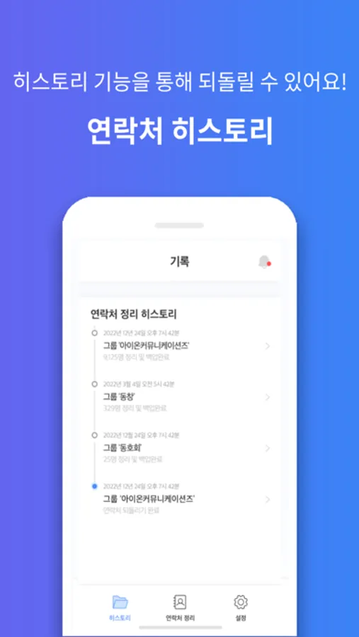 * 히스토리: 잘못된 정리에 대해서 언제든지 이전 연락처로 복구가 가능합니다.