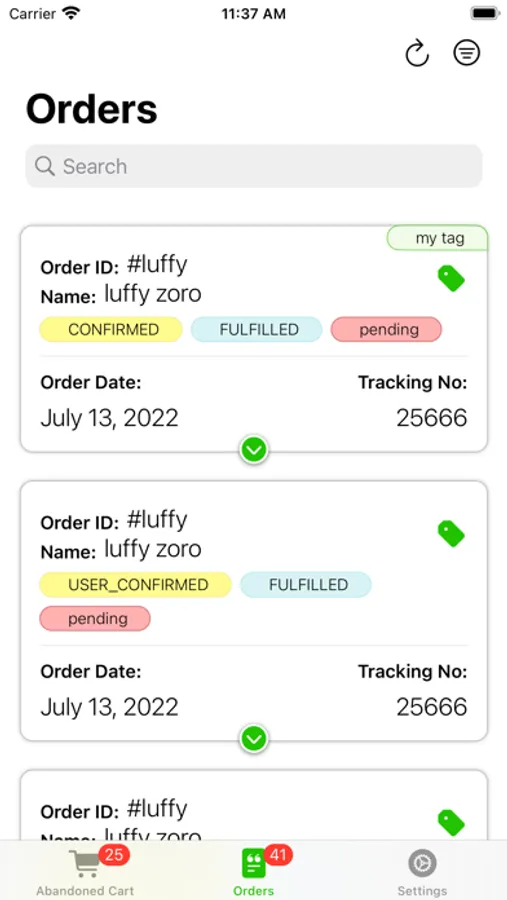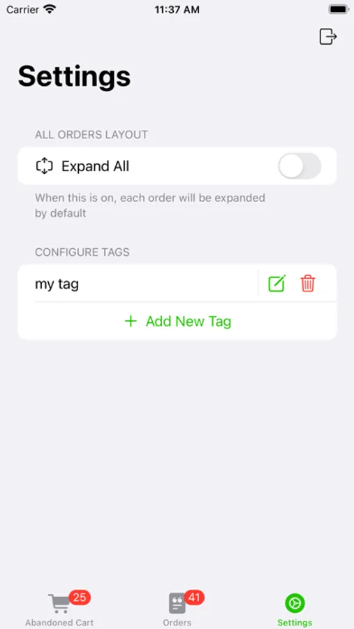 • In the Settings section you can create your own custom Tags to assign it to orders and based on the tags you filter your orders as well using the Filter button next to search.